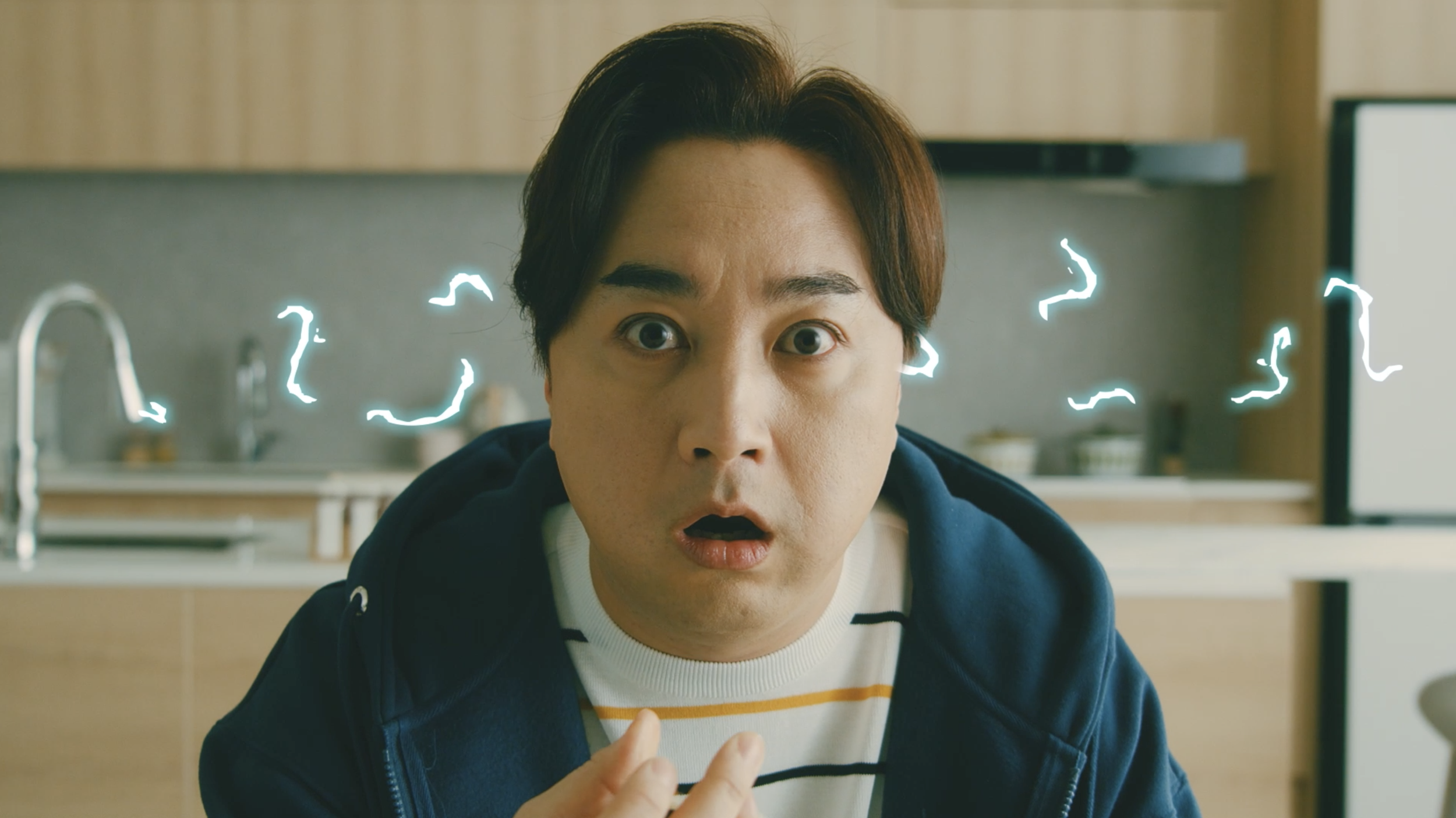 An advertisement featuring a popular comedian in Korea shot using the technique of 1 person playing 2 roles. This required compositing for the 1 person 2 roles, as well as intermittent cleaning work for the kimbap visuals and microwave.