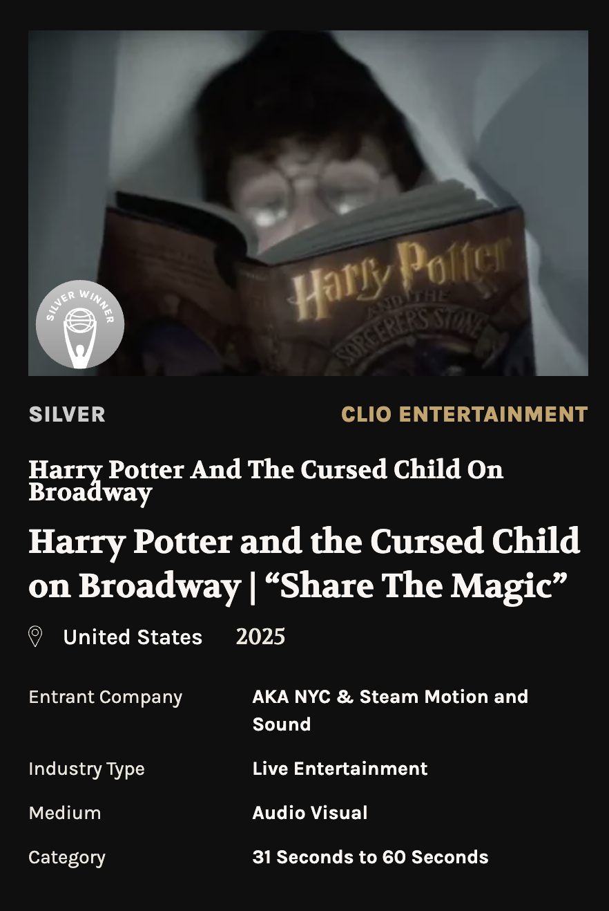 I worked on the official Broadway marketing trailer for Harry Potter and the Cursed Child, produced as part of the global launch campaign and distributed across theatrical and digital platforms worldwide.